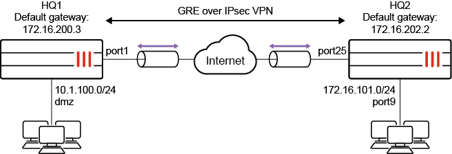 config system interface edit "port1" set ip 172.16.200.1 255.255.255.0 next edit "dmz" set ip 10.1.100.1 255.255.255.0 next end config router static edit 1 set gateway 172.16.200.3 set device "port1" next end - HQ2.