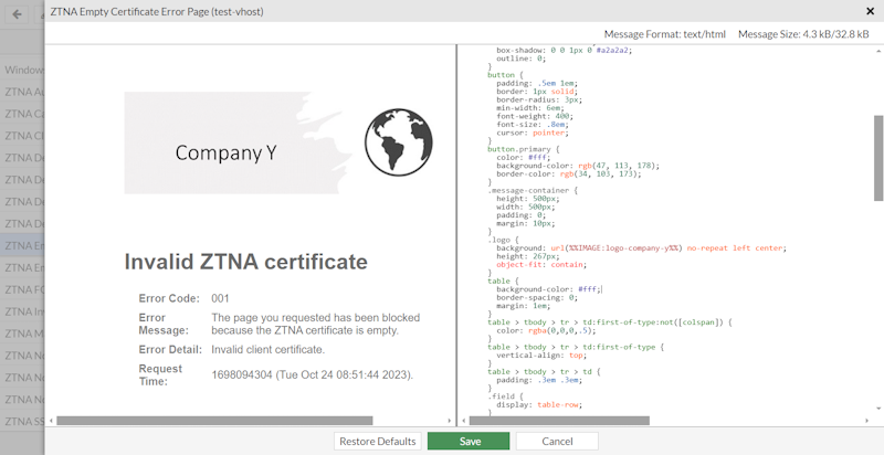 In this example, a ZTNA virtual host named server1.ztna.local is mapped to a replacement message group named test-vhost, and the group includes a customized ZTNA Empty Certificate Error Page message. The message is customized with a Company Y logo.