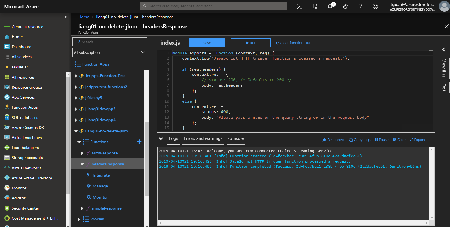 When the automation stitch is triggered, the Security Fabric > Automation page shows the stitch trigger time. In Azure, the function log shows that the function was called, executed, and finished: