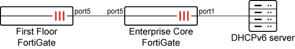 A downstream interface (port5) connects the First Floor FortiGate to the Enterprise Core FortiGate. The First Floor FortiGate interface (port5) is configured to receive the IPv6 address and DNS server address from the Enterprise Core FortiGate using DHCP addressing mode or auto-configuration.