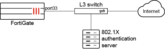 In this example, the FortiGate connects to an L3 switch that is not physically secured. All devices that connect to the internet through the L3 switch must be authenticated with 802.1X on the switch port by either a username and password (PEAP), or a user certificate (TLS). Configuration examples for both EAP authentication methods on port33 are shown.