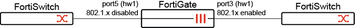In this example, FortiGate is connected to two switches, and a virtual switch named hw1 is configured with two port members: port3 and port5. 802.1x authentication is enabled for port3 and disabled for port5.