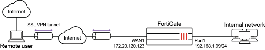 config vpn ssl settings set servercert "Fortinet_Factory" set tunnel-ip-pools "SSLVPN_TUNNEL_ADDR1" set tunnel-ipv6-pools "SSLVPN_TUNNEL_IPv6_ADDR1" set source-interface "wan1" set source-address "all" set source-address6 "all" set default-portal "full-access" config authentication-rule edit 1 set groups "sslvpngroup" set portal "my-split-tunnel-portal" next end end - Configure one SSL VPN firewall policy to allow remote user to access the internal network. Traffic is dropped from internal to remote client.