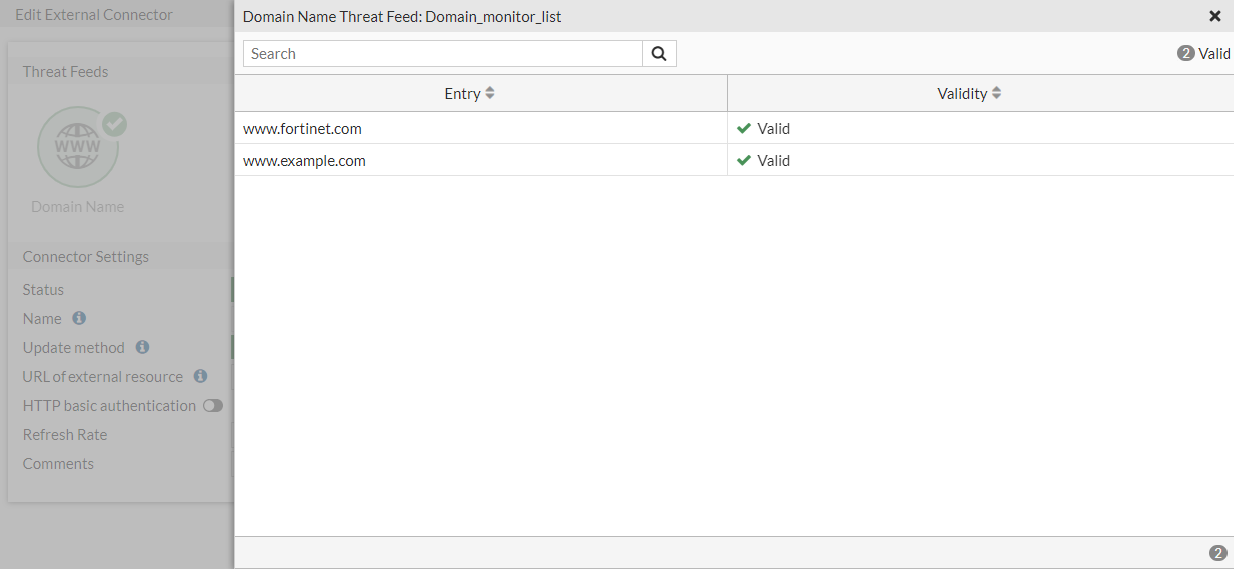 - Edit the connector, then click View Entries to view the domain names in the feed (fortinet.com and example.com).