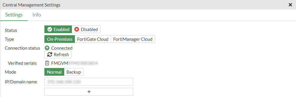 # diagnose fdsm central-mgmt-status Connection status: Up Registration status: Registered Serial: FMGVMSTM2300xxxx