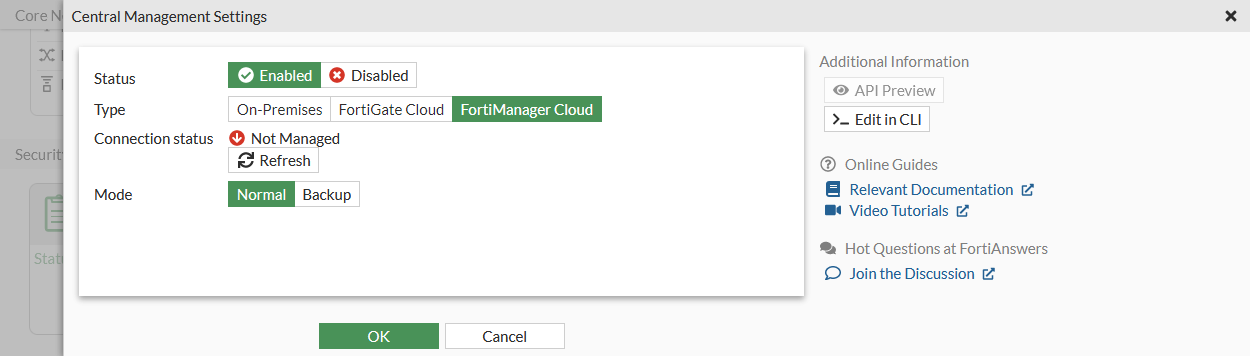 1. Go to Security Fabric > Fabric Connectors and double-click the Central Management card.