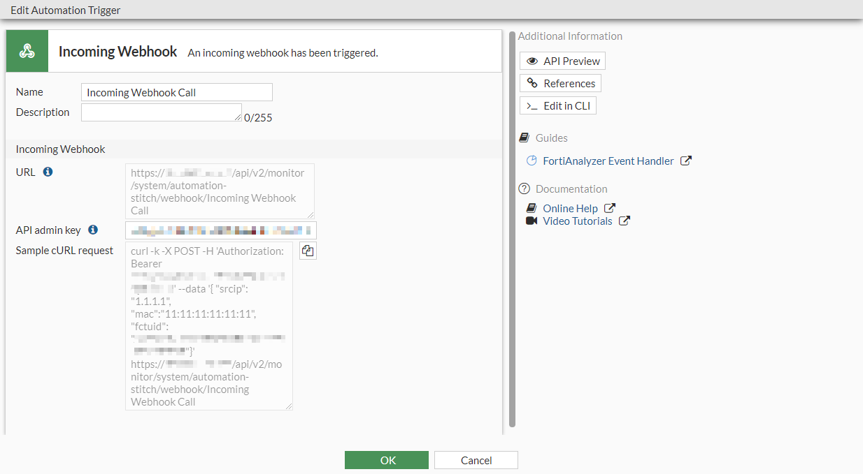 root@pc:~# curl -k -X POST -H 'Authorization: Bearer cfgtct1mmx3fQxr4khb994p7swdfmk' --data '{ "mac":"0c:0a:00:0c:ce:b0", "fctuid": "0000BB0B0ABD0D00B0D0A0B0E0F0B00B"}' https://172.16.116.226/api/v2/monitor/system/automation-stitch/webhook/Incoming%20Webhook%20Quarantine