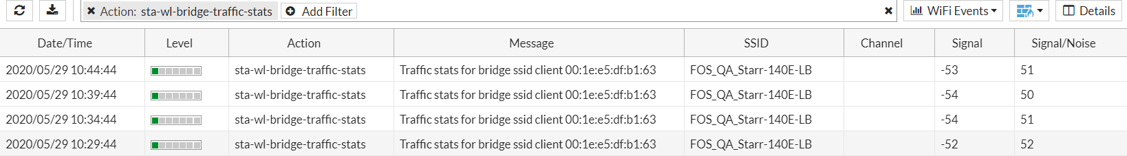 signalandsnrvalues:date=2020-05-26 time=17:48:57 logid="0104043687" type="event" subtype="wireless" level="information" vd="vdom1" eventtime=1590540537841497433 tz="-0700" logdesc="Traffic stats for station with bridge wlan" sn="FP231ETF20000455" ap="FP231ETF20000455" vap="wifi.fap.01" ssid="FOS_QA_Starr-140E-LB-cap-2" srcip=10.128.100.4 user="N/A" stamac="00:1e:e5:df:b1:63" signal=-53 snr=52 sentbyte=8970016 rcvdbyte=985910 nextstat=300 action="sta-wl-bridge-traffic-stats" msg="Traffic stats for bridge ssid client 00:1e:e5:df:b1:63"
