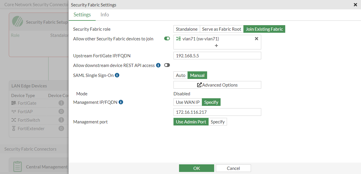 - In the Settings tab, set the Security Fabric role to Join Existing Fabric.