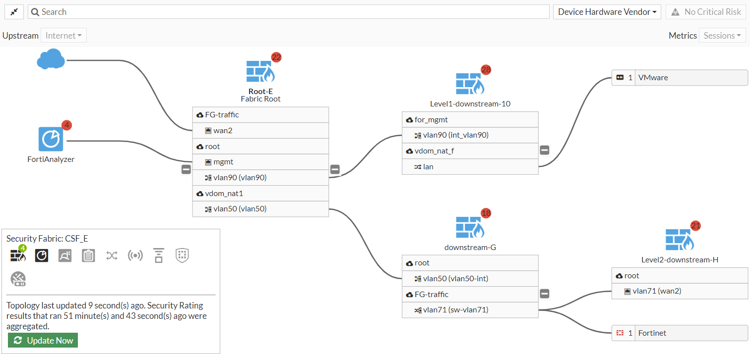 Once all the devices are authorized, the physical topology page shows the root and downstream FortiGates. The logical topology page shows the root and downstream FortiGates connected to interfaces in their corresponding VDOMs.