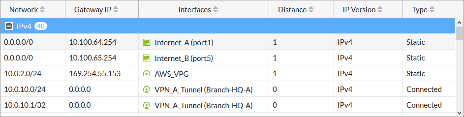 1. If Optimal dashboards is selected, go to Dashboard > Network and expand the Routing widget to view the routing table.