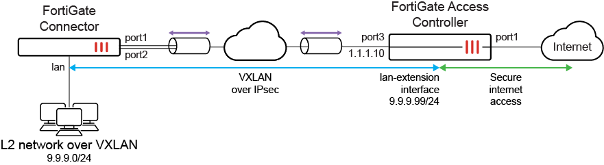 After the Connector discovers the Controller and is authorized by the Controller, the Controller pushes a FortiGate LAN extension profile to the Connector. The Connector uses the profile configurations to form two IPsec tunnels back to the Controller. Additional VXLAN aggregate interfaces are automatically configured to create an L2 network between the Connector LAN port and a virtual LAN extension interface on the Controller. Clients behind the Connector can then connect to the internet through the Controller that is securing the internet connection.