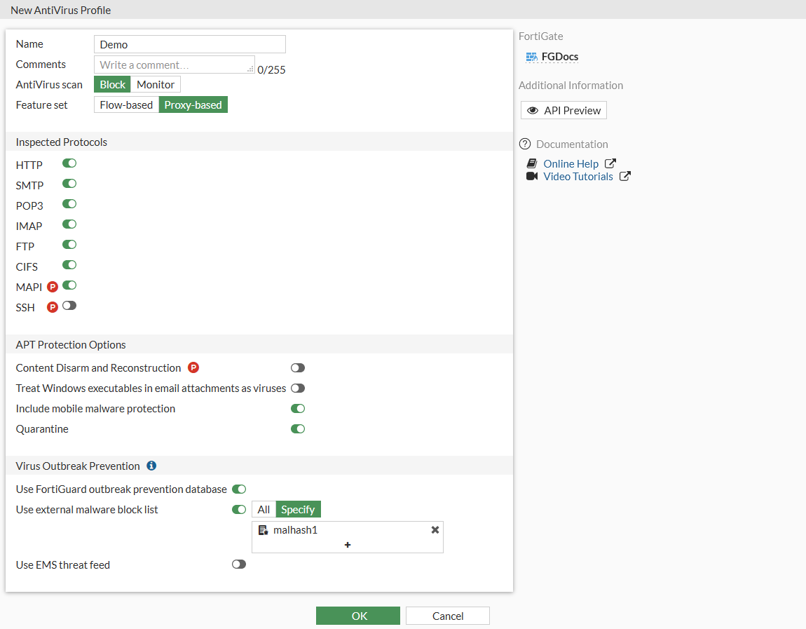 - Go to Security Profiles > AntiVirus and edit the antivirus profile.