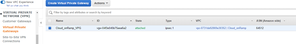 - Go to Virtual Private Network (VPN) > Virtual Private Gateways to confirm that a virtual private gateway (VPG) has been created. In this case it is attached to the Cloud_onRamp VPC that contains the FortiGate and servers.