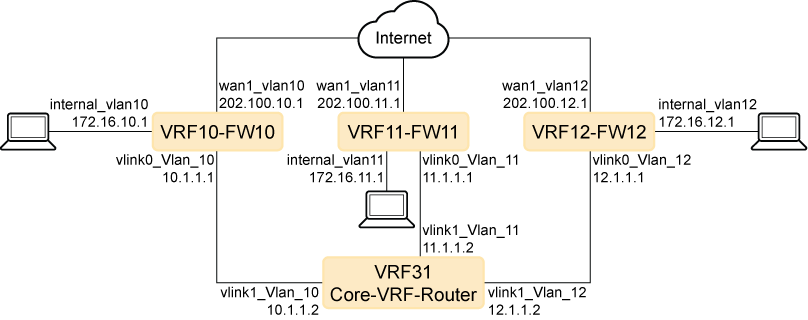 Configure VRF10, VRF11, and VRF12 on the Internal and WAN VLAN sub-interfaces: