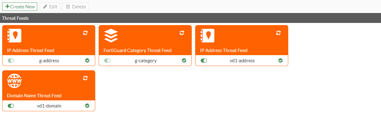 When multi-VDOM mode is enabled, a threat feed external connector can be defined in global or within a VDOM. Global threat feeds can be used in any VDOM, but cannot be edited within the VDOM. FortiGuard category and domain name-based external feeds have an added category number field to identify the threat feed. The threat feed name in global must start with g-. Threat feed names in VDOMs cannot start with g-.
