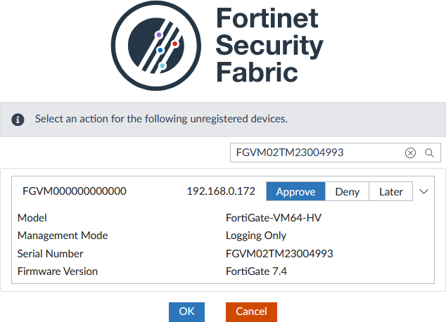 Select Approve in the row for the FortiGate, and then click OK to authorize the FortiGate.