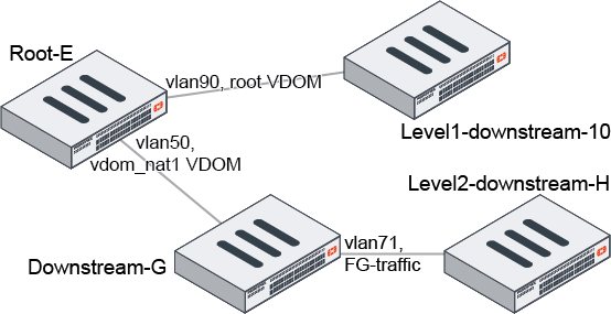 In this topology, there is a root FortiGate with three FortiGates connected through two different VDOMs. The root FortiGate is able to manage all devices running in multi-VDOM mode.