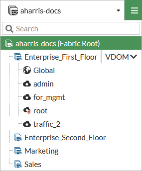 Users can navigate to downstream FortiGate devices and VDOMs directly from the root FortiGate using the Fabric selection menu.