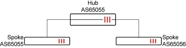 The following example demonstrates assigning the remote AS of two spokes (AS65505 and AS65006) to a single BGP neighbor group of a hub (AS65505).