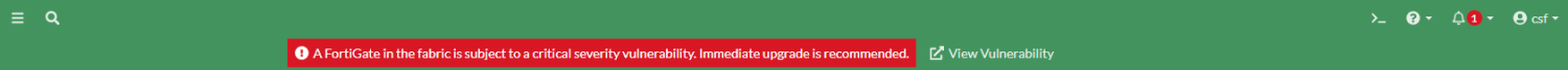 Warning message: if the security rating result indicates a vulnerability with a critical severity, then the FortiOS GUI displays a warning message in the header and a new notification under the bell icon. The View Vulnerability link appears in the header for global administrators.