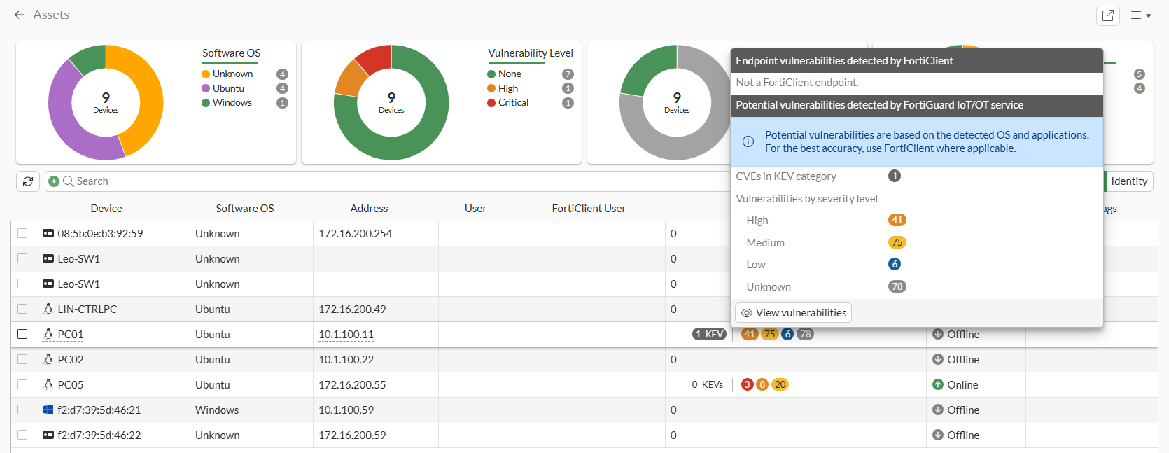 Hover over the vulnerabilities. In the tooltip, the CVEs in KEV category field shows the number of potential KEVs detected by the FortiGuard IoT/OT service: