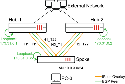BGP neighbors between the spoke and hubs are over loopback IP addresses