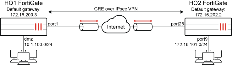 config system interface edit "port1" set ip 172.16.200.1 255.255.255.0 next edit "dmz" set ip 10.1.100.1 255.255.255.0 next end config router static edit 1 set gateway 172.16.200.3 set device "port1" next end - HQ2.