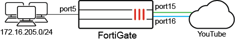 In this example, the FortiGate is configured to load-balance between two WAN interfaces, port15 and port16. A health check is configured in passive mode, and SLA thresholds are set. Passive WAN health measurement is enabled on the SD-WAN policy.