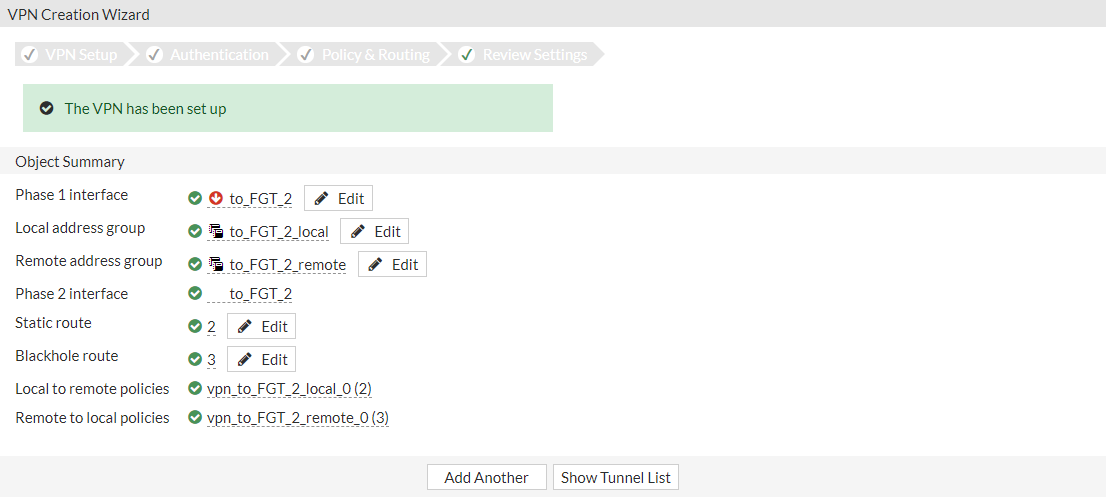 A confirmation screen shows a summary of the configuration including the firewall address groups for both the local and remote subnets, static routes, and security policies.