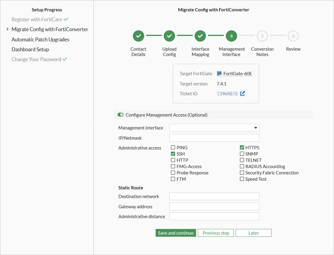 Optionally, configure management access on the target FortiGate (FGTA), then click Save and continue.
