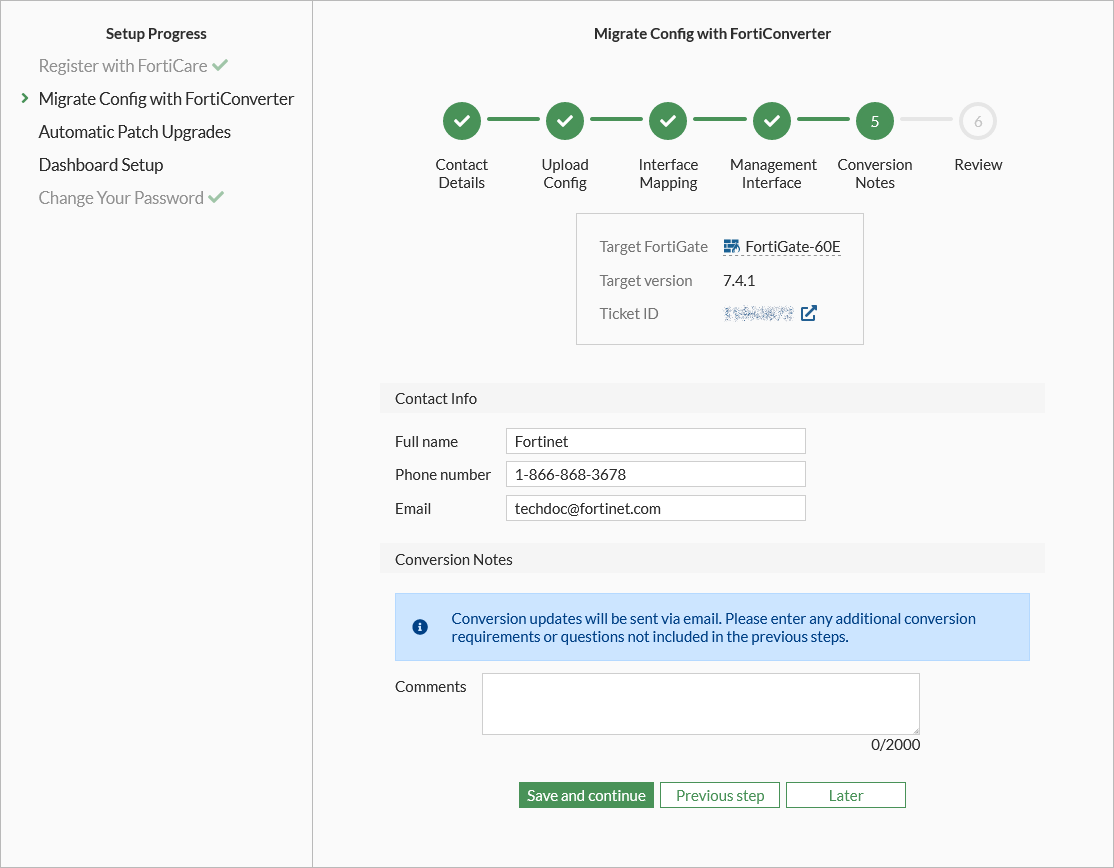 Click Save and continue, then wait for the FGTB configuration file to be uploaded to FortiConverter and processed. After the configuration is uploaded, the Allow FortiConverter to obtain config file once is automatically disabled on FGTB.