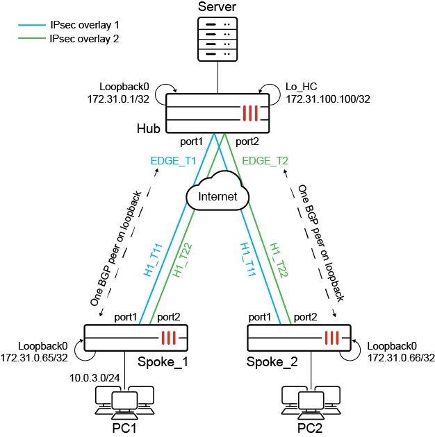 In this topology, each FortiGate’s BGP router ID is based on its Loopback0 interface. Each spoke has SLA health checks defined to send ICMP probes to the server’s Lo_HC interface on 172.31.100.100. The ICMP probes include embedded SLA information for each SD-WAN overlay member.