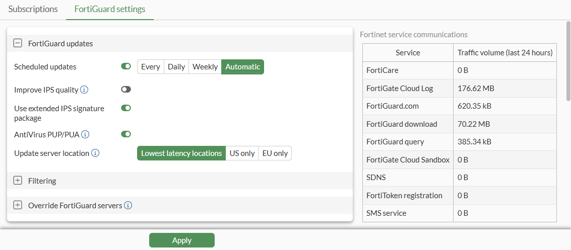 Go to the System > FortiGuard > FortiGuard settings tab.