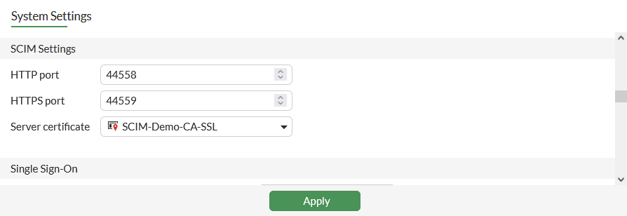 In the SCIM Settings section, configure the HTTP port, HTTPS port, and Server certificate as required.