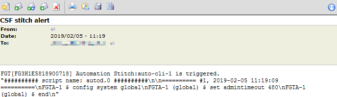 config system automation-action edit "admintimeout" set action-type cli-script set script "config system global set admintimeout 479 end" set output-size 10 set timeout 0 set accprofile "super_admin" next edit "auto-cli-1_email" set action-type email set email-to "admin@fortinet.com" set email-subject "CSF stitch alert" set message "%%results%%" next end -