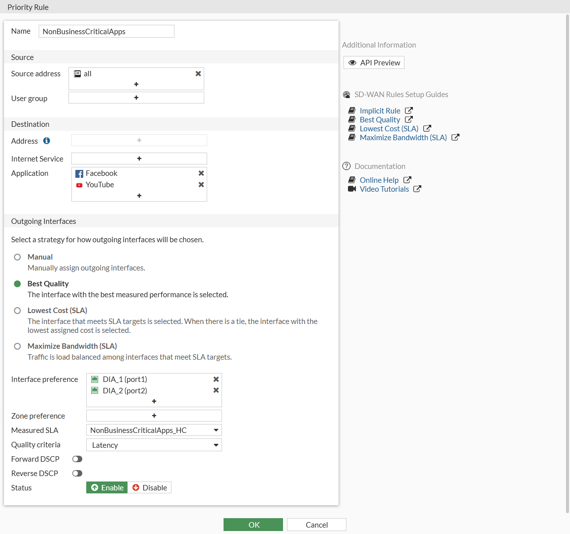 This rule will steer your non-business critical traffic to the appropriate link based on the Best Quality. No SLA target must be met, as the best link is selected based on the configured quality criteria and interface preference order.