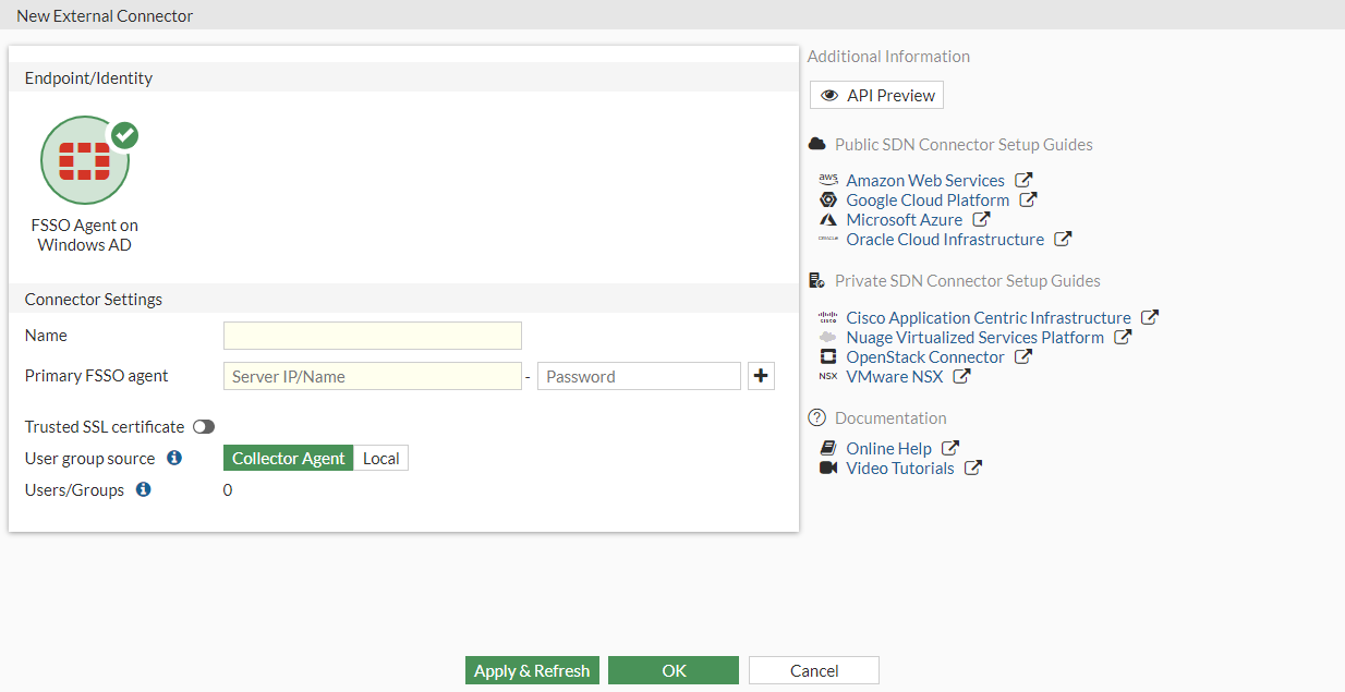 - Collector Agent: User groups will be pushed to the FortiGate from the collector agent. Click Apply & Refresh to fetch group filters from the collector agent.