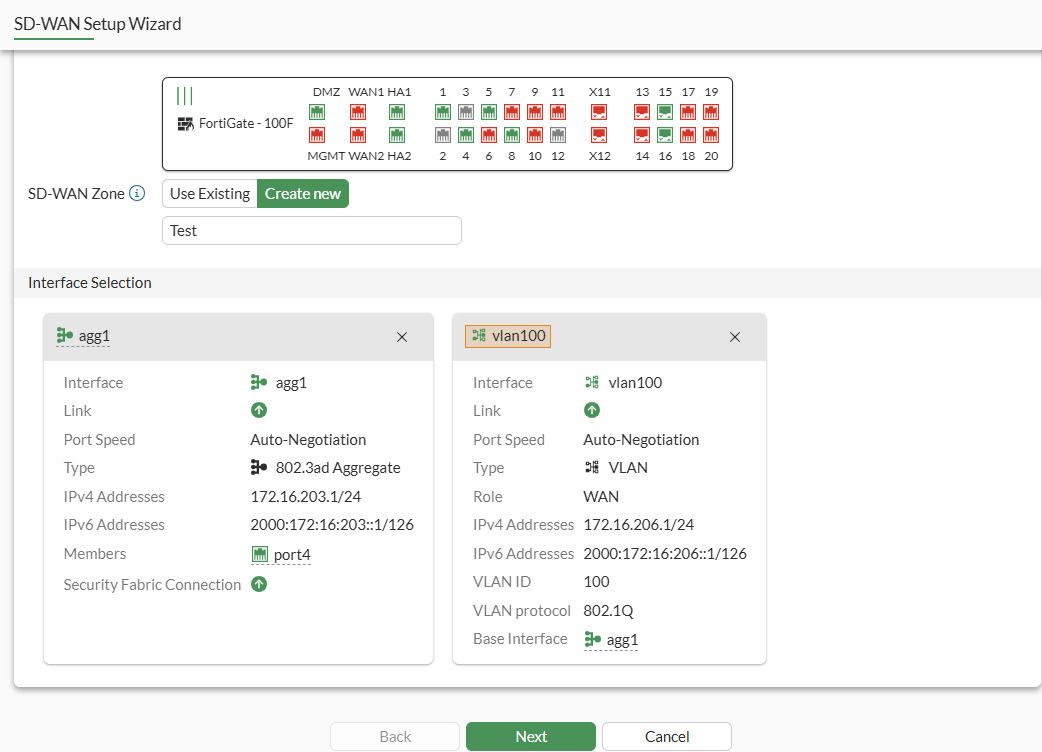 The selected interfaces become members of the SD-WAN zone. This example creates a zone named Test and uses two interfaces (agg1 and vlan100).