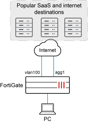 This example describes how to use the SD-WAN Setup wizard to create an SD-WAN configuration with one SD-WAN zone (named Test) and two SD-WAN members (agg1 and vlan100). The wizard also guides you to complete the networking, performance SLA, and SD-WAN rule. After the wizard completes, configure a default static route for the SD-WAN interface.