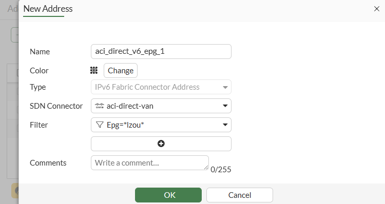 IPv6 addresses can be imported from an APIC controller. The ACI direct connection SDN connectors support the Tenant, Application, Epg, Tag, and Esg filters.