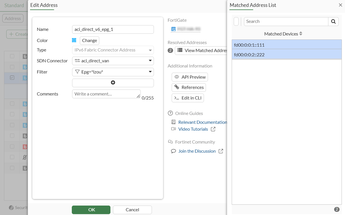 In the following example, an APIC controller with IPv6 addresses is configured. The IPv6 addresses are then imported to the FortiGate through an ACI direct connection SDN connector.