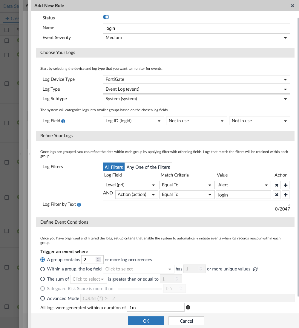 On the FortiAnalyzer, configure an event handler for the automation stitch. In this example, the event handler is triggered by two or more invalid log in attempts to the FortiGate in less than one minute. See Creating a custom event handler in the FortiAnalyzer Administration Guide for more information.