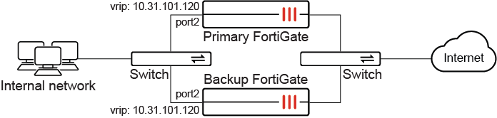 This example consists of a VRRP domain with two FortiGates that connect an internal network to the internet. The FortiGate port2 interfaces connect to the internal network, and a VRRP virtual router is added to each port2 interface with VRRP virtual MAC addresses enabled. The internal network default route is 10.31.101.120. Each FortiGate port2 interface has an IP address that is different from the virtual router IP address. Since vrrp-virtual-mac is enabled, upon failover, the new primary VRRP router will use the same VMAC as the previous router.