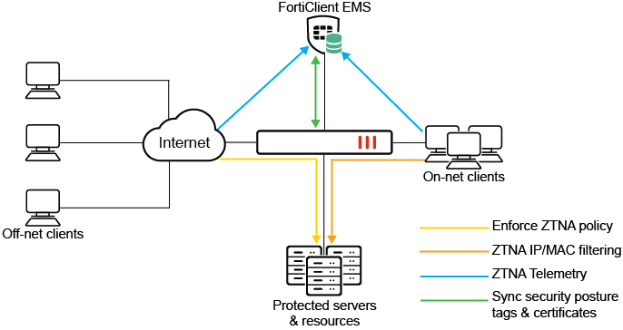 When a device's information changes, such as when a client moves from on-net to off-net, or their security posture changes, EMS is updated with the new device information and then updates the FortiGate. The FortiGate's WAD daemon can use this information when processing ZTNA traffic. If an endpoint's security posture change causes it to no longer match the ZTNA policy criteria on an existing session, then the session is terminated.