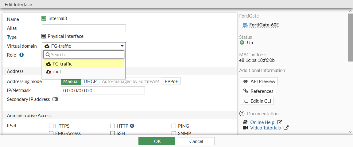- Configure the fields, including the Name, Virtual Domain, IP information, Administrative Access, and so on, then click OK.