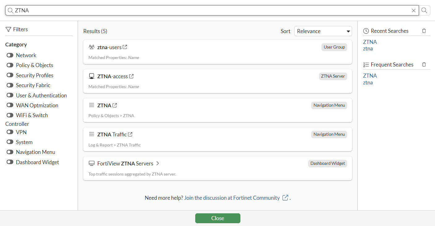 In this example, searching for the word ZTNA yields the following results: