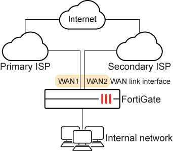 Dual internet connections, also referred to as dual WAN or redundant internet connections, refers to using two FortiGate interfaces to connect to the Internet. This is generally accomplished with SD-WAN, but this legacy solution provides the means to configure dual WAN without using SD-WAN. You can use dual internet connections in several ways:
