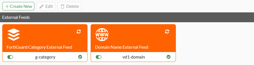 When multi-VDOM mode is enabled, an external feed connector can be defined in global or within a VDOM. Global external feeds can be used in any VDOM, but cannot be edited within the VDOM. FortiGuard category and domain name-based external feeds have an added category number field to identify the external feed. The external feed name in global must start with g-. External feed names in VDOMs cannot start with g-.