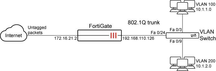 The FortiGate internal interface connects to the VLAN switch through an 802.1Q trunk. The internal interface has an IP address of 192.168.110.126 and is configured with two VLAN subinterfaces (VLAN_100 and VLAN_200). The external interface has an IP address of 172.16.21.2 and connects to the Internet. The external interface has no VLAN subinterfaces.